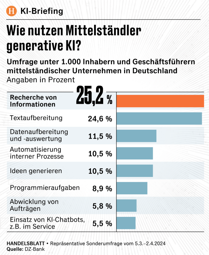Die Unsicherheit des Einsatzes von künstlicher Intelligenz in mittelständischen Unternehmen belegt eine repräsentative Umfrage der DZ Bank unter mehr als 1000 Entscheidungsträgern wie das deutsche Handelsblatt am 1. Juni 2024 berichtet.